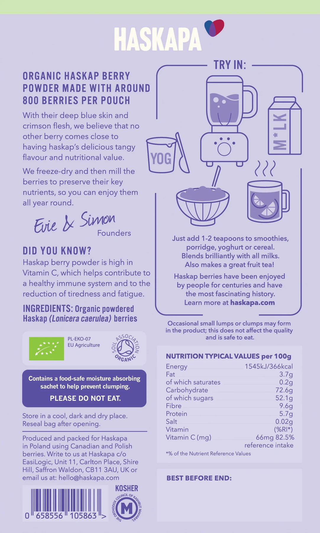 • An organic version of the signature pure berry powder - certified by the UK Soil Association, this organic freeze-dried haskap berry powder is made with the whole berry and nothing else added.